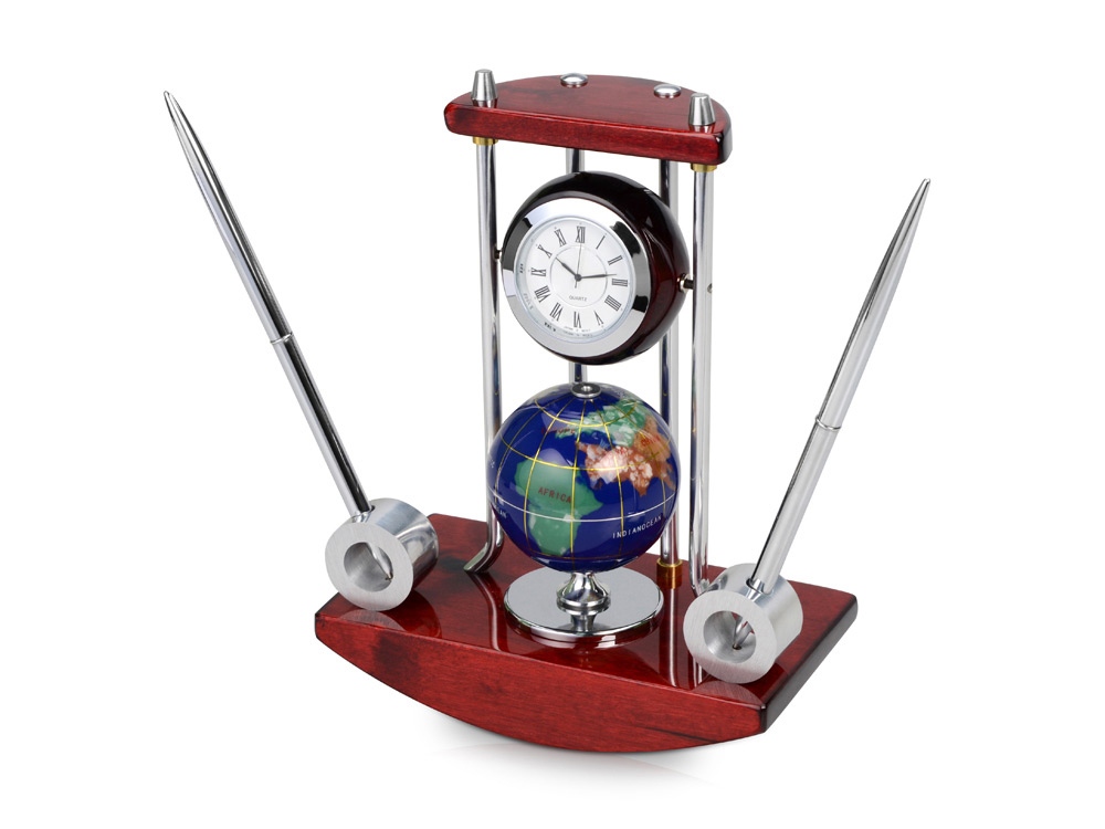 Строгие линии и формы, качественные материалы – это все говорит о продукте представительского класса. Настольный прибор состоит из точных часов, модели глобуса и двух ручек на подставке. На корпус прибора можно нанести гравировку. Гравировка (оптоволоконный лазер) (Без чернения) на данный товар осуществляется бесплатно. Оплачивается только настройка оборудования в размере 1100 рублей на весь тираж.